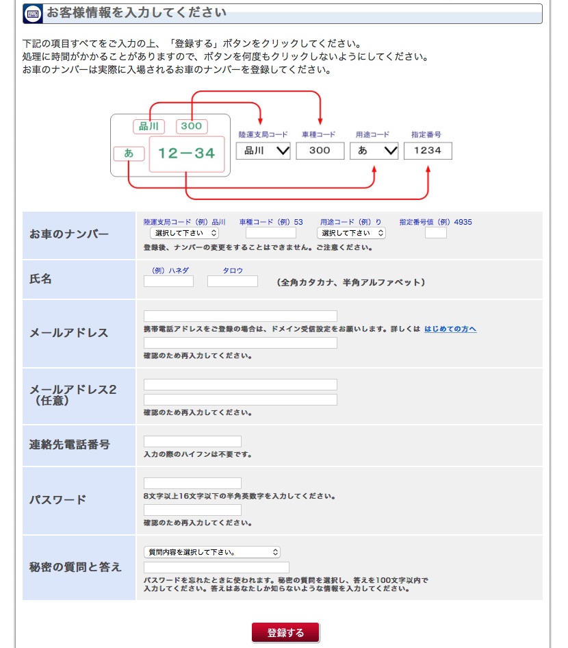 車のナンバーと氏名、メールアドレス、電話番号といった情報を登録します。