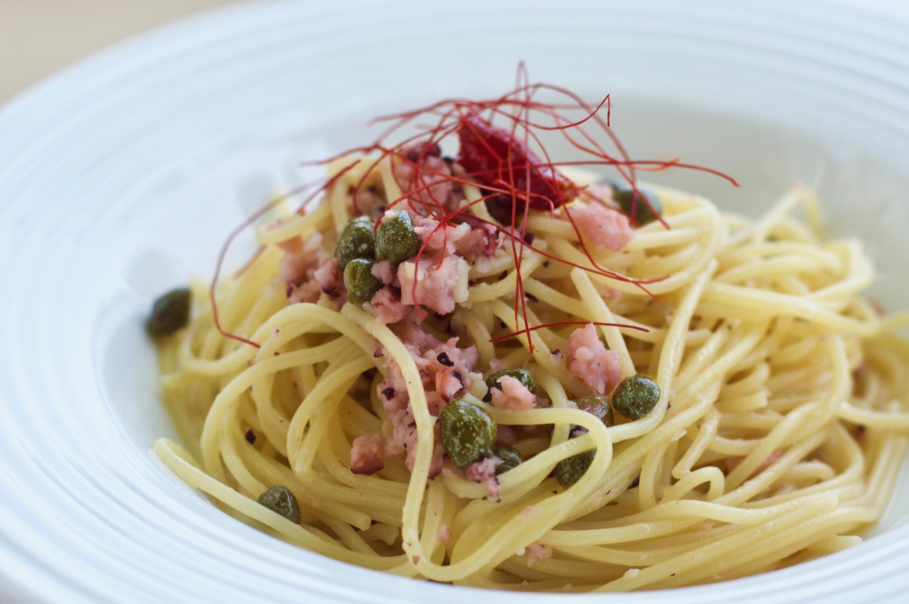 看板メニューは「フェットチーネオリジナーレ」で、大きなパルミジャーノ・レッジャーノチーズの中にフェットチーネを入れ、フェットチーネとチーズを絡めたパスタです。